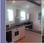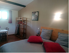 un salon avec cuisine américaine une chambre avec un lit double une salle de bains avec douche et WC Location orientée plein sud